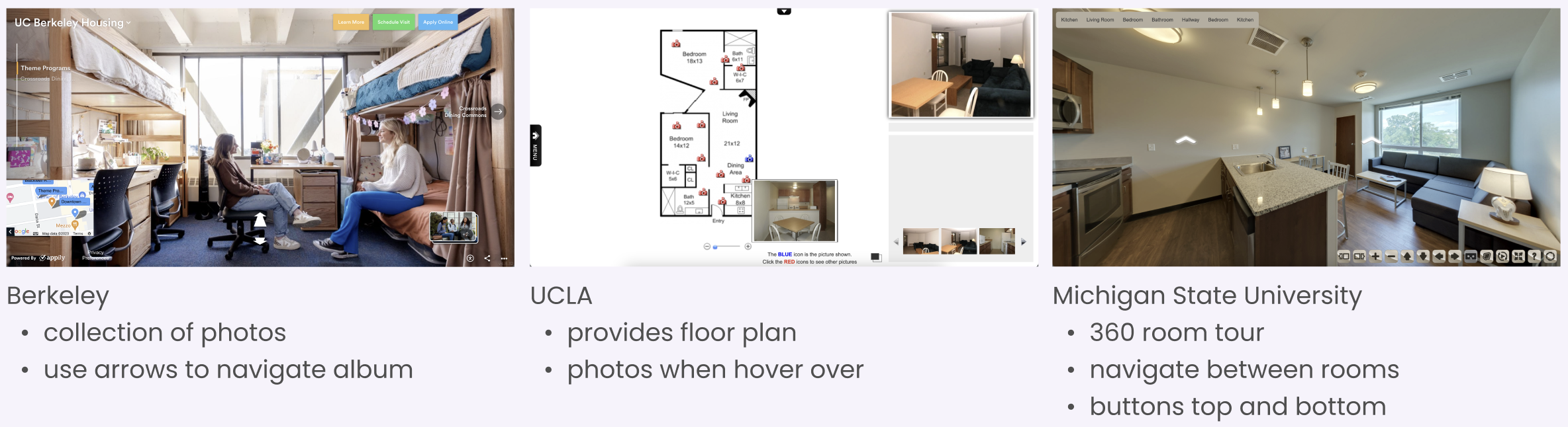 dorm websites to explore how they allowed students to view their prospective dorms. Some examples include photos with